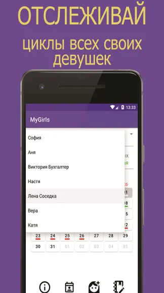 Сохраняйте данные о месячных циклов всех своих девушек с приложением MyGirls. Оно отслеживает циклы, месячные, дни овуляции и дни для зачатия. Приложение помогает прогнозировать ПМС, месячные, овуляцию. Это уникальное приложение для контроля над зачатием поможет вам хранить историю и прогнозировать поведение всех своих девушек - оно дает вам всю необходимую информацию! Хотите узнать, когда начнутся следующие месячные у подруги? ПМС опять застал врасплох? С нашим бесплатным приложением - календарем месячных и калькулятором овуляции - как никогда просто отслеживать циклы своих девушек. Это приложение - календарь для Андроид для контроля цикла, месячных и ПСМ позволяет: * Отслеживать дни с вероятным зачатием * Добавлять и удалять девушек из списка * Теперь не будет сюрпризов с месячными на свидании * Можно установить индивидуальный календарь для всех подруг Простой вид календаря, на котором отображаются дни цикла для всех ваших близких девушек - все дни подсвечены нужным цветом. На одном экране можно увидеть всех своих девушек и их текущее состояние. Отличный способ спланировать свои свидания и не быть разочарованным!