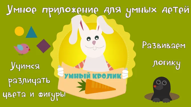 Умный кролик - это детские обучающие и развивающие игры для детей и малышей Представляем бесплатно обучающую игру для малышей в возрасте 2-3-4 года. В приложении в игровой форме ребенок научится различать формы и простые геометрические фигуры. Это бесплатная логическая игра для малышей поможет развить сообразительность и мелкую моторику. В обучающей игре малыши учатся находить одинаковые предметы. Развиваем зрительную память и помогаем кролику перейти дальше. Вашим детям понравится, что в бесплатной развивашке, выполнив логические задачи, кролик получает бонусное средство передвижения. Развивающая игра с сортировкой предметов по форме учит ориентироваться в пространстве, искать знакомые предметы и определять их форму. Развивалка с сортировкой овощей и фруктов по цвету корзины поможет детям развить интеллект. В бесплатной обучающей логической игре для самых маленьких детей мы постарались помочь Вам и Вашим малышам не только приятно провести время, но и развить пространственное мышление, развить мелкую моторику, тренировать память, научить различать цвета и формы. Сделать это можно бесплатно, просто загрузите развивающее приложение на свое устройство. Как играть в игру "Умный кролик": 1. В развивающей игре с корзинкой малыш должен выбрать овощи или фрукты того цвета, какого цвета корзинка. 2. Логическая игра с фигурами. Дошкольник выбирает фигуру той формы, которая соответствует окошку на горке. 3. Развивашка с машинкой. Ребенок смотрит на образец, какую машинку хочет кролик. Внимательно сопоставляет цвета на деталях. 4. Развивающая игра с карточками. Малыш ищет одинаковые предметы в открывающихся окошках. 5. Логическая игра на расстановку фигур по цветам и форме в соответствующие ячейки. Дети внимательно смотрят, какая фигура где должна быть, и ставят в нужное место. 6. Логическая развивающая игра с предметами. Дошколята сортируют их в ящики, форму которых они напоминают. Игра предназначена для детей и малышей в возрасте 2-3-4 года. Умный кролик - это бесплатные детские обучающие и развивающие игры для детей дошкольного возраста. Советуем также обратить внимание и на другие наши развивающие детские приложения. Мы не только вместе учим весело буквы, звуки, алфавит, но также цифры, фигуры, цвета, простые математические действия. Мы создаем детские обучающие и развивающие игры для вас и ваших детей. Мы открыты для всех Ваших пожеланий! Пишите Ваши предложения на support@catdonut.com.