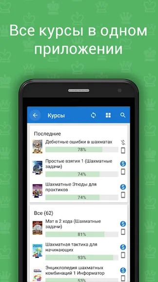 "Chess King - Обучение Шахматам" - уникальный сборник курсов и задач по шахматам. Он включает курсы по тактике и стратегии, которые разделены на уровни от начинающих до опытных шахматистов и настоящих профессионалов. Подготовьтесь к сражению за шахматной доской с любым онлайн или оффлайн соперником с этим персональным тренером. С помощью этой программы вы сможете улучшить свои шахматные навыки, узнать новые тактические приемы и комбинации, а также закрепить полученные знания на практике. Программа выступает в роли тренера, который дает задачи и помогает в их решении. Она дает подсказки, объяснения и даже показывает опровержения на ошибочные ходы, которые вы можете сделать. Некоторые курсы имеют теоретический раздел, в котором поясняются методы игры в определенной стадии партии на реальных примерах. Теоретические уроки интерактивны, то есть вы можете не только читать текст уроков, но и делать ходы на доске и самостоятельно разбирать непонятные моменты. Преимущества программы: ♔ Более 100 курсов в одном приложении. Выбирайте наиболее подходящий! ♔ Обучение шахматам. В случае ошибок даются подсказки ♔ Задачи высокого качества, проверенные на корректность ♔ Для решения задачи нужно найти все принципиальные ходы, заданные автором ♔ Для типичных ошибочных ходов даются опровержения ♔ Любую позицию из задачи можно анализировать при помощи компьютера ♔ Интерактивные теоретические уроки ♔ Шахматная тактика для детей ♔ Шахматный анализ и дебютное дерево ♔ Выбирайте подходящую тему доски и 2D фигур ♔ Программа отслеживает изменение рейтинга ELO ♔ Режим теста с гибкими настройками ♔ Режим закладок для понравившихся упражнений ♔ Адаптивная поддержка планшетов ♔ Для работы не требуется подключение к интернету ♔ Вы можете подключить бесплатный аккаунт Chess King и учиться одновременно на нескольких устройствах: Android, iOS, macOS или Web ♔ Приложение полностью переведено на русский язык Каждый курс содержит бесплатную часть, на которой вы можете его опробовать и ознакомиться с примерами упражнений. Каждый курс покупается отдельно, но вы также можете купить подписку для доступа к нескольким курсам сразу, но на ограниченный период времени. В программе вы можете изучить следующие курсы: ♔ Обучение шахматам - от простого к сложному ♔ Шахматная школа I разряда - КМС ♔ Шахматная школа II-I разряда ♔ Шахматная тактика - III-II разряд ♔ Бобби Фишер ♔ Задачник шахматных комбинаций ♔ Шахматная тактика для начинающих ♔ Защита от мата (Шахматные задачи) ♔ Шахматная стратегия (1800-2400) ♔ Шахматные окончания (1600-2400 ELO) ♔ Матовые шахматные комбинации ♔ Шахматные комбинации ♔ Шахматный миттельшпиль ♔ Шахматная стратегия для начинающих ♔ CT-ART 4.0 (Шахматные комбинации 1200-2400 ELO) ♔ Мат в 1, 2, 3-4 хода ♔ Простая Шахматная Тактика ♔ Дебютные ошибки в шахматах ♔ Эндшпили для начинающих ♔ Шахматные дебюты (1400-2000) ♔ Шахматные Этюды для практиков ♔ Простые взятия ♔ Сергей Карякин - Элита шахмат ♔ Шахматная тактика в Сицилианской защите ♔ Шахматная тактика во Французской защите ♔ Шахматная тактика в защите Каро-Канн ♔ Шахматная тактика в защите Грюнфельда ♔ Шахматная школа для начинающих ♔ Шахматная тактика в Скандинавской защите ♔ Михаил Таль ♔ Искусство защиты ♔ Магнус Карлсен - Легенда шахмат ♔ Шахматная тактика в Староиндийской защите ♔ Шахматная тактика в О