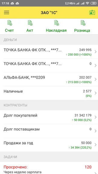 Хорошее приложение. У меня небольшое предприятие, когда много бываю в пути, доступ к данным со смартфона иногда очень выручает. Можно быстро закрыть оперативные вопросы. Выставить счёт, счёт-фактуру и отправить заказчику. Отправить платёж, проверить состояние взаиморасчетов с заказчиком. И всё это, как говорится, не отходя от кассы.