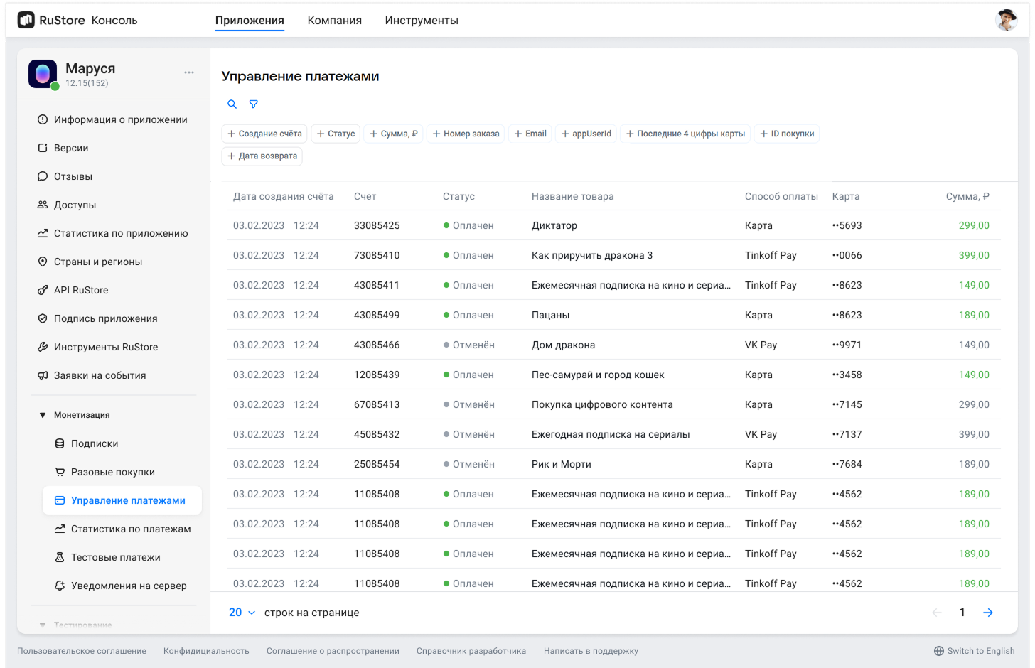 В RuStore Консоли можно просматривать платежи по каждому приложению, для которого подключена монетизация.