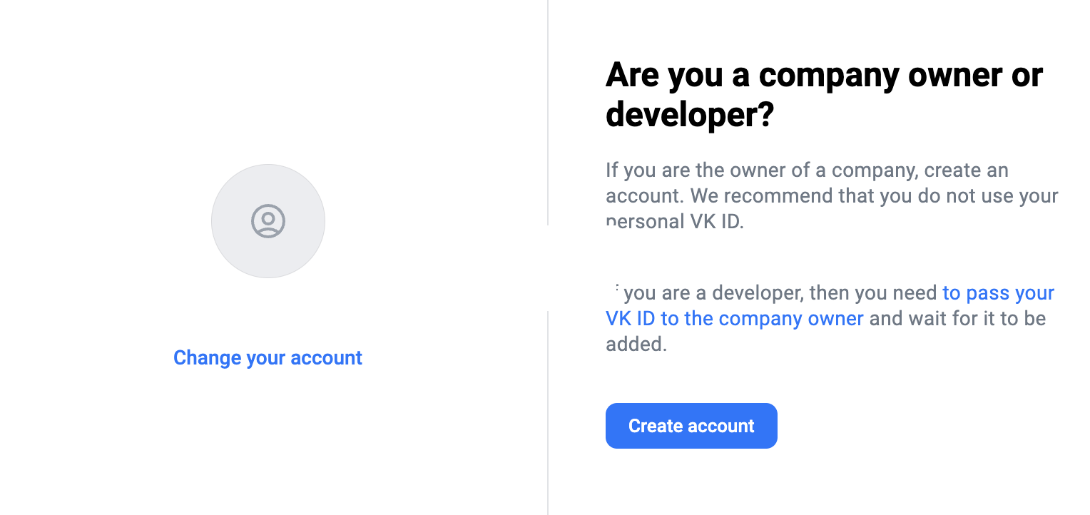 You can go to the account creation form from the page of RuStore Console. To do that, click Create account.