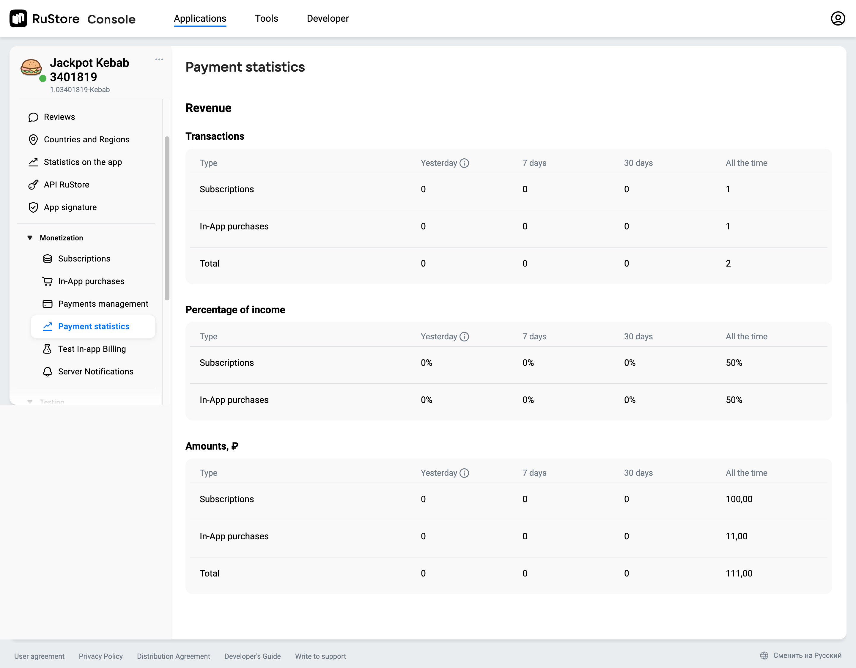 On the Monetization Statistics page you can view total income and returns from all sources.