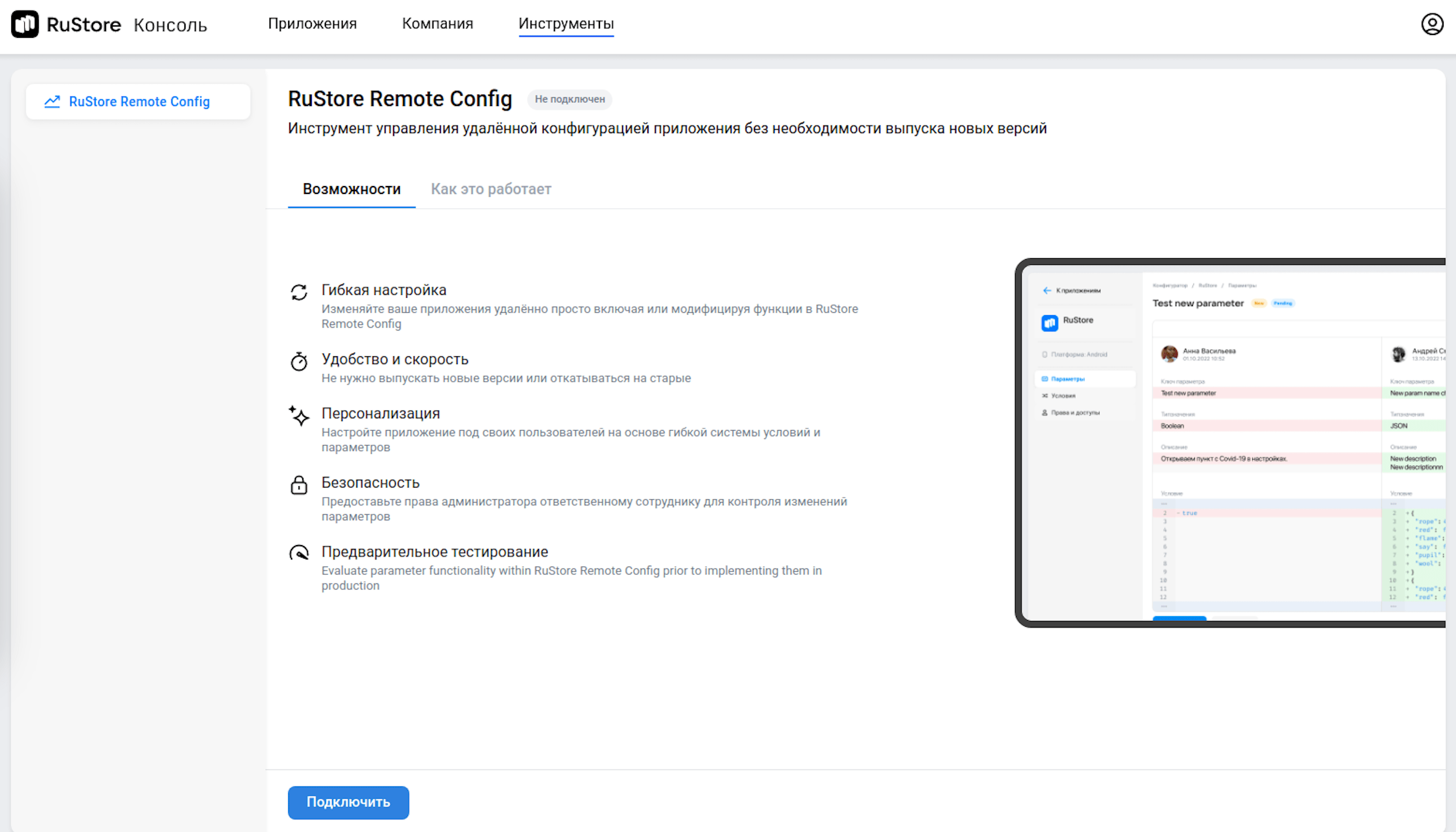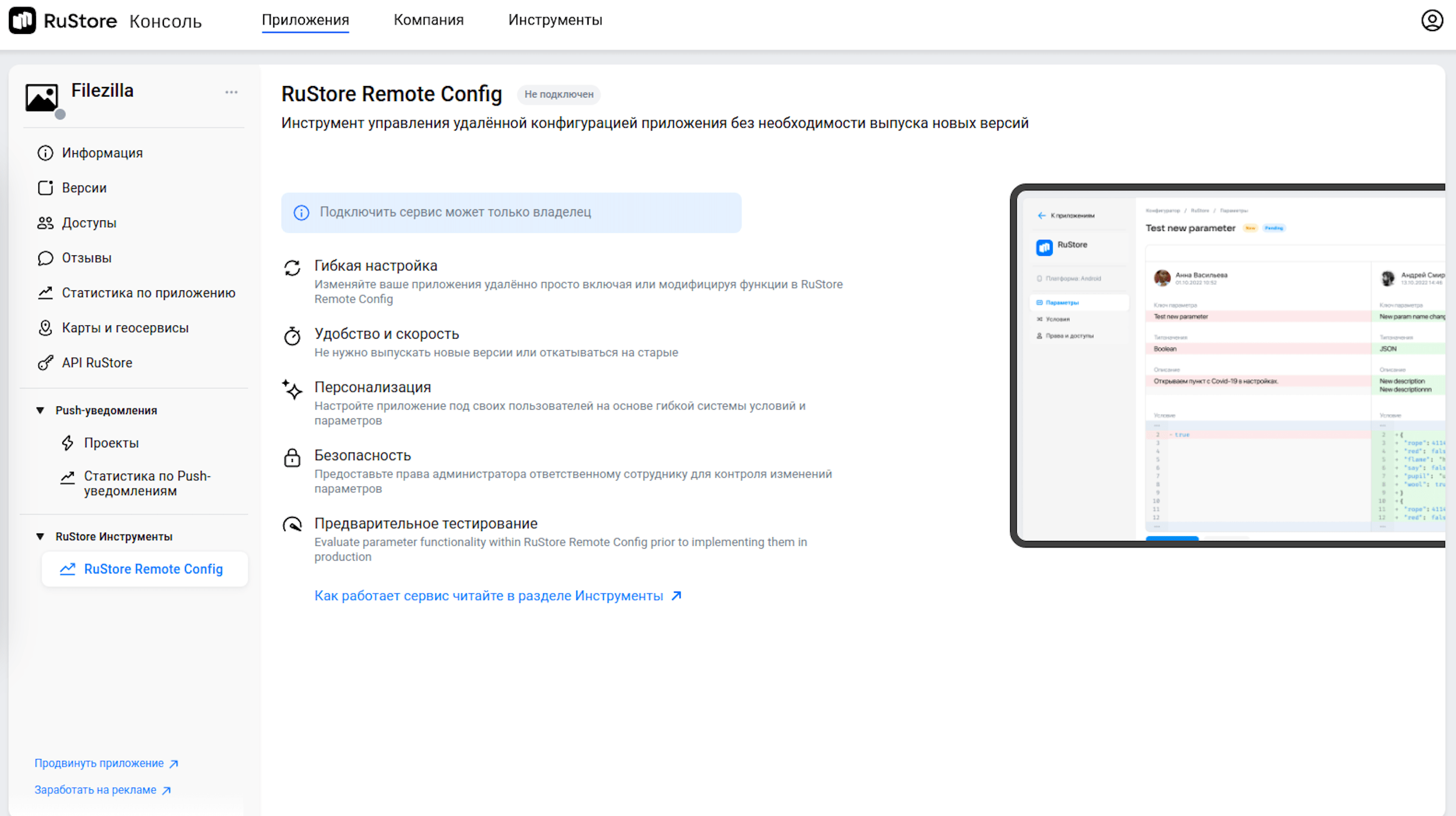 Use “Tools” in RuStore Console to connect developer tools to your apps.