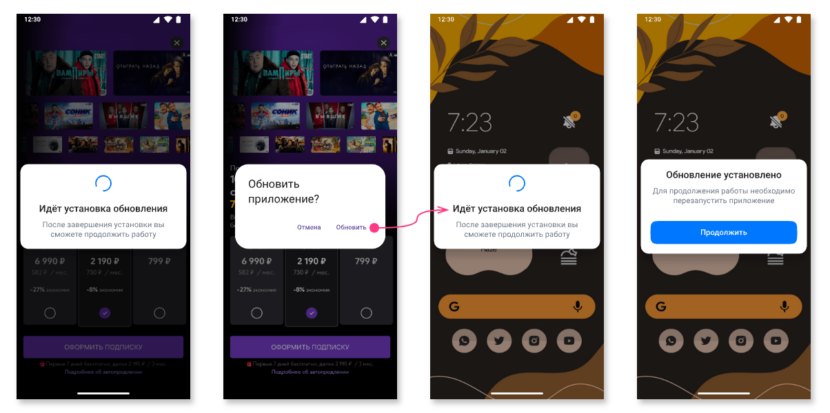RESULT_OK (int = -1)— обновление выполнено, код может быть не получен, т.к. приложение в момент обновления завершается.RESULT_CANCELED (int = 0)— флоу прервано пользователем или произошла ошибка. Предполагается, что при получении этого кода, следует завершить работу приложения.ACTIVITY_NOT_FOUND (int = 2)— RuStore не установлен, либо установлена версия, которая не поддерживает принудительное обновление (RuStore versionCode<191).
