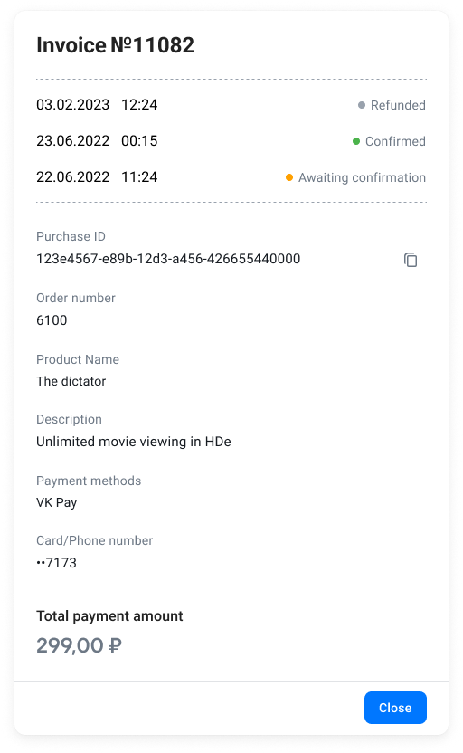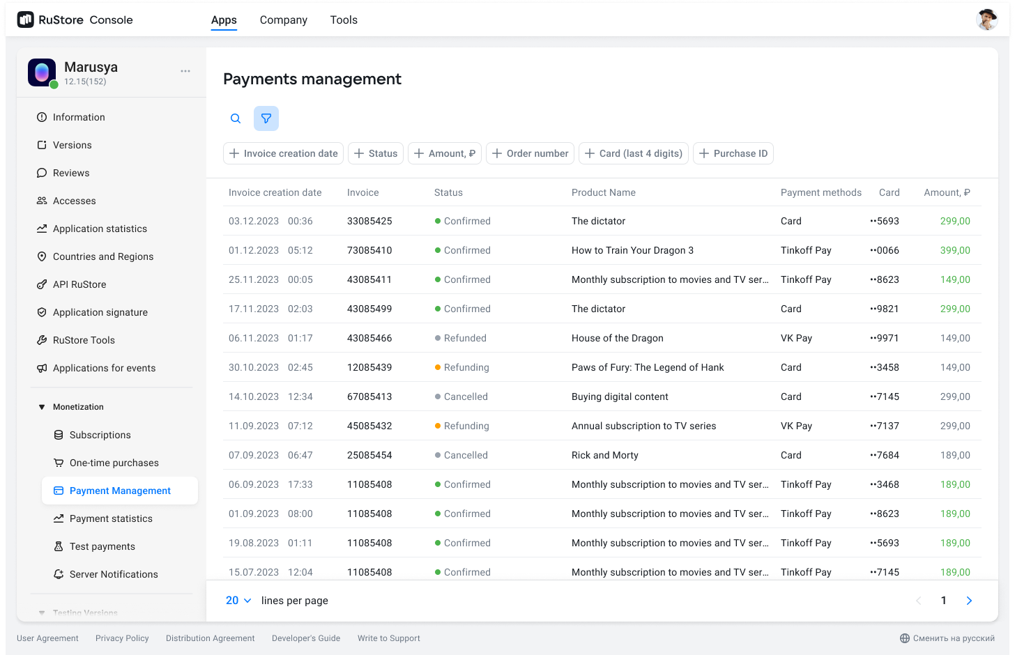 货币化支付管理本页总览在 RuStore 高效管理支付的指南 在 RuStore 控制台中,您可以查看每个已经变现的应用的付款记录。 信息只有具有角色 公司所有者、管理员和财务经理的用户才能管理付款并处理退款。 如何查看付款信息